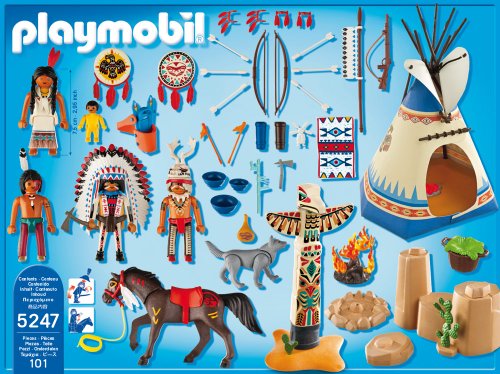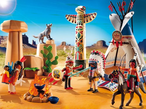 - Description du produit: Que manigancent les indiens dans leur camp au loin ? Camp d'indiens avec 5 personnages dont 1 bébé, un cheval, un tipi, un feu de camp, un loup, ainsi que de nombreux accessoires (arc, boucliers, un totem indien…)