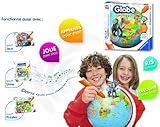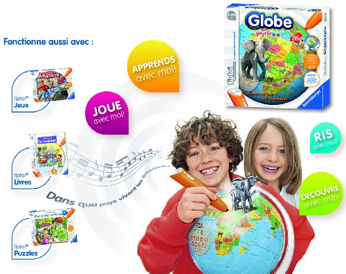 • Description du produit: Découvre et joue avec ta planète. – Où est située la principauté de Monaco ? Quelle est la capitale de l'Australie ? Dans quels pays règnent encore des rois ? Une fois le puzzleball de 96 pièces terminé, tiptoi entre en action. Avec le Globe, ce sont 11 rubriques d'informations sur plus de 196 pays qui viennent nourrir la curiosité de tous. Que l'enfant joue seul ou à plusieurs, il pourra découvrir des milliers d'informations sur les différents pays de la planète : la plus haute montagne, la capitale, une information caractéristique du pays, le fuseau horaire ou bien encore, comment dire « Bonjour » dans la langue nationale. Et pour assimiler les connaissances de manière ludique, le Globe interactif propose 4 jeux captivants sur le thème de la géographie. Vous pourrez même entendre le cri de véritables animaux.