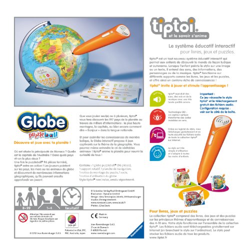 • Contenu du packaging: 1 globe puzzleball (96 pièces), 1 support rotatif, 1 planche de navigation, 1 notice de montage du puzzle, 1 socle, 1 notie d'utilisation. Stylo tiptoi non inclus, vendu séparément.