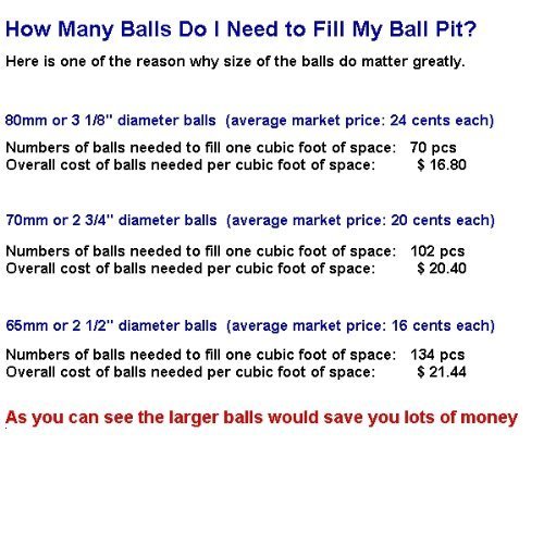 - Pack of 150 pcs Large 3.1″ Crush-Proof Balls. Beware of the size of the competitor's products as our balls are almost 100% larger than their 2.5″(65mm) balls, and about 60% larger than their 2.75″(70mm) balls. Commercial Establishments please order the Heavy Duty Commercial Grade balls offered through Amazon Listing: Pack of 500 balls = ASIN# B00673VSDC ; Pack of 1000 Balls = ASIN# B0067PN44G
