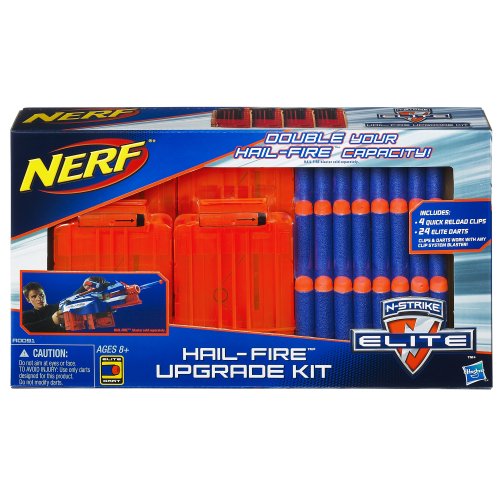 Join the N-Strike Elite and get the edge in battle with the Hail-Fire Upgrade Kit! Already the ultimate in N-Strike performance, the Hail-Fire blaster (sold separately) has the highest capacity of any Nerf blaster and it can unleash a storm of darts at the nearest target. But with the Hail-Fire Upgrade Kit you can make that storm last twice as long! Double your Hail-Fire capacity for twice the action with the 4 Quick Reload Clips and 24 Elite Darts. The clips and darts work with any Clip System blaster, so lock and load your blaster of choice. You’ll be the one to beat with the Hail-Fire Upgrade Kit!