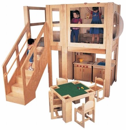 Preferred Strictly for Kids Mainstream School Age Explorer 5 Expanded Size Loft with steps on the left. Includes a mirror, book display and bubble panel above to create a quiet reading space, open below for dramatic play or other activities. Super industrial strength construction of solid maple, Baltic Birch plywood, clear unbreakable Lexan windows and fully carpeted. 120''w x 60''d x 60''h deck, 130''w x 109''d x 105''h overall, Blue MagiCarpet. Assembles easily in approximately 1 to 2 hours. Lifetime warranty. Color: Natural Maple; Blue carpet. Dimensions: 130w x 109d x 105h. Please Note: Color may not be as shown