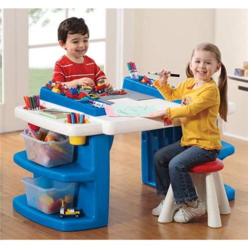 Ideal for art projects, the Step2 Build and Store Block and Activity Table offers a large work area for children to build, draw, and create. This multipurpose plastic table features molded-in storage areas, as well as cups, bins, and removable trays to keep project supplies organized. Designed for kids aged 3 years and up, the activity table has building accessories that work with LEGO and Mega Bloks sets. It also includes a small plastic stool so kids can work comfortably–sitting or standing–on projects.
