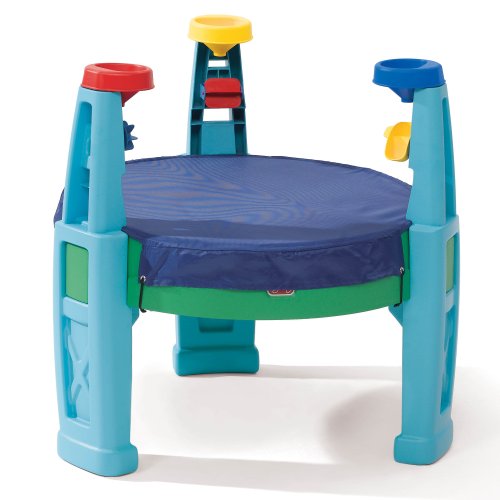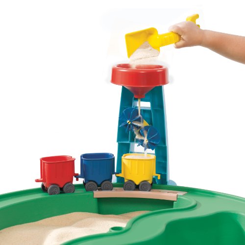 Jump on board the transportation station of fun. This sturdy table contains two compartments for both sand and water play and includes a 16-piece accessory set with 3 train cars, 2 boats, 3 funnels, 1 spinner, 1 paddle wheel, 1 see-saw scoop, 3 track pieces, a shovel rake and a removable cover with elastic straps. Its train track runs around the perimeter of the table and through the middle, separating the sand and water compartments, and funnels atop the table legs act as “loading stations” for creative play. This raised table helps keep feet clean and dry and is designed to hold a 40” (101.6 cm) umbrella (sold separately). Adult assembly required.