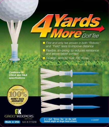 The “4 Yards More” Golf Tee is a reusable golf tee that will add more yards to your driving distance. The tee is designed with a rigid polymer stake and a dynamic elastomer crown. The body and individual fingers of the crown flex with the force of the drive to reduce resistance at impact. The ball launches off the tee with less friction and lower ball spin resulting in longer, straighter drives. Another great advantage “4 Yards More” Golf Tee is the height gauge, which gives golfers consistent tee depth. This allows golfers to swing consistently, gaining distance and accuracy. In addition, the multi material construction produces a tee that can tolerate 100+ hits, keeping golf courses and tee boxes free of discarded disposable tees. The use of durable, multiple-plastic materials also cuts down on deforestation, making the product environmentally friendly. All sizes give you extra distance: Red: “Short Tee” perfect for for Par 3s and driving with irons Yellow: “Standard Tee” the ideal choice for most drivers and driving woods Blue: “Driver Tee” for the right launch angle on large head drivers Green: “The Extreme” the longest allowed by USGA and R&A