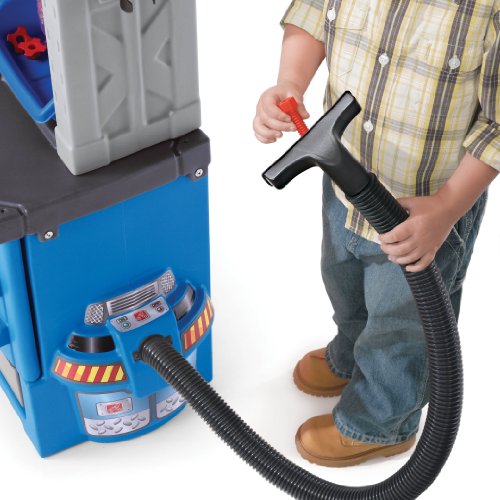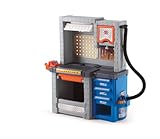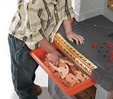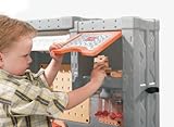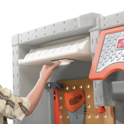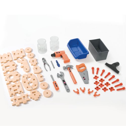 Unlimited building fun with a realistic workbench just like the pros. This deluxe workbench for the little builder who loves to work with their hands; encourages eye hand coordination and includes a large work surface with screw holes, recesses for nut and screw storage. Its unique realistic-looking “wood” is made from indestructible Durafoam which allows children to build creations while using their imagination (Instructions included for 4 projects.). It features a tool chest looking cabinet, slide in/out drawer, parts bin and hanging jars for storage and easy clean-up and a realistic working overhead shop light(3 “AAA” batteries not included). 50pc accessory set include a battery-operated drill with realistic sounds and interchangeable drill bits for maximum realism (2 ”AA” batteries not included), 8 screws, 8 nuts, saw, hammer, pliers, adjustable wrench, screw driver, 17 “wood” pieces, plus bins and jars for storage, spring action vise and pretend shop vac. Minimal adult assembly required.