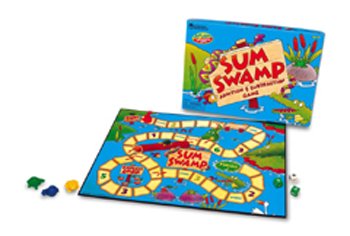 Sum Swamp will introduce your child to numbers and the basic operations of addition and subtraction. Players roll all three dice and create a number sentence by placing the highest number first, the operation symbol second, and the smallest number last. The player then adds or subtracts the numbers, and moves ahead the sum or difference. The “even” or “odd” spaces on the board help players learn about the even and odd categories in the number system. Learning addition and subtraction is much more fun when you're wading through the swamp.