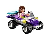 Have some summer fun in Heartlake City with OliviaÕs Beach Buggy! Pack up her surfboard and cruise over the sand dunes toward the seashore. Use the wrench to tune up the buggy and hop right over the biggest dunes! After a radical session of riding the waves, head over to the beach stand for an orange or an ice pop to enjoy under the leafy shade of the coconut tree. Includes Olivia mini-doll figure.