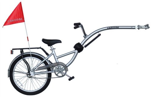 This sturdy, sleek trailer bike is a great way to show your kids the rules of cycling. Made with aluminum, it has a steel hitch with quick-release system that fits most seat posts. The single-wheel design includes a large safety flag and comfort-grip handles. For kids ages 4-8 years old . Single speed 20 in. wheel folding model with aluminum frame . Fits nearly all 26 in. and 700c bikes . Proven steel hitch with quick-release system fits most seatposts . Safety flag, full coverage chain guard and splash guards . Weight capacity of 100 pounds . 62 in. L x 22 in. W x 41 in. H Great way to teach children the rules of cycling, while keeping them close and safe. Parent rider has total control of steering, braking, speed and balance. Your son or daughter can pedal to help you along or just coast and enjoy the scenery.