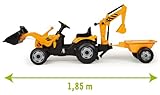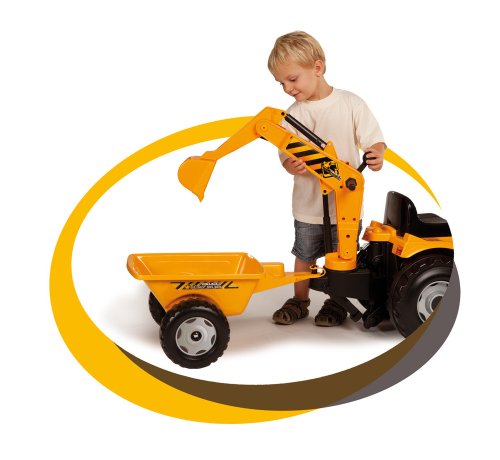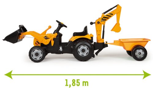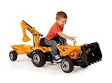 Trattore con doppia benna, rimorchio, volante direzionale, cavalletto di sostegno retrattile, sedile aggiustabile ed effetti sonori.