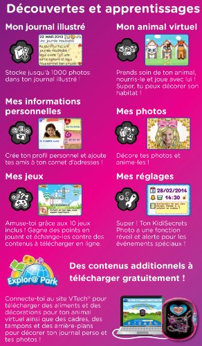 Tes secrets seront bien gardés Journal illustré Un vrai journal intime dans lequel tu peux ajouter tes secrets en sélectionnant le jour et la date souhaitée. Super ! Ajoute une icône humeur du jour et une photo souvenir à ta page de journal ! Mon animal virtuel Adopte un animal : chien, chat ou poney et soigne-le ! Gagne des points dans les différents jeux et échange-les contre des aliments et des décorations pour ton animal virtuel en connectant ton KidiSecrets Photo à l’Explor@ Park de VTech. Mes informations personnelles Ajoute tes infos perso et crée ton carnet d’adresses. Ajoute les numéros de tes copines et leur photo ! |