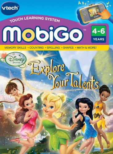 The VTech MobiGo Touch Learning System Disney Fairies: Explore Your Talents. game reunites your child with fairy friends including Tinker Bell, Silvermist, Rosetta, Iridessa and Fawn. Whether water skating, making flowers bloom or feeding the squirrels, the fairies help your child practice preschool skills with the touch of a finger. 80-250900 Features: -Features favorite Disney fairy friends Tinker Bell, Silvermist, Rosetta, Iridessa and Fawn. And the voice of Tinker Bell!.-Explore the fairy world.-Play 6 learning games as different fairies that teach counting, addition & subtraction, letters, spelling, shapes, creativity and more!.-Use for 4-6 years age.